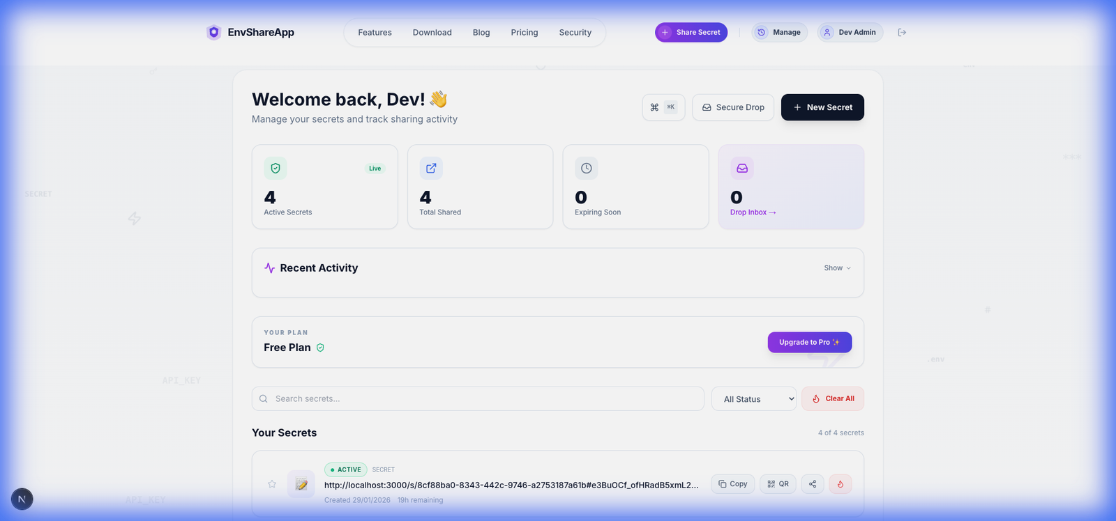 EnvShareApp is an end-to-encryption platform for sensitive strings and files. Unlike traditional storage, we never see your data. Encryption happens entirely within your execution environment (Browser, CLI, or SDK).